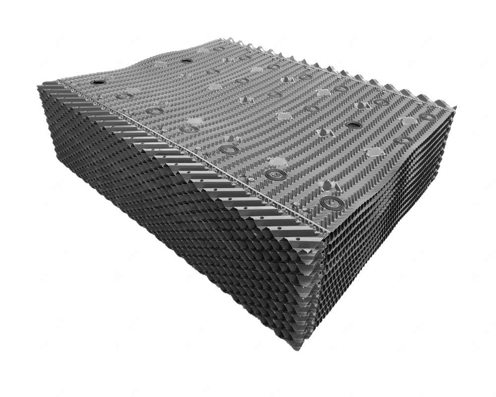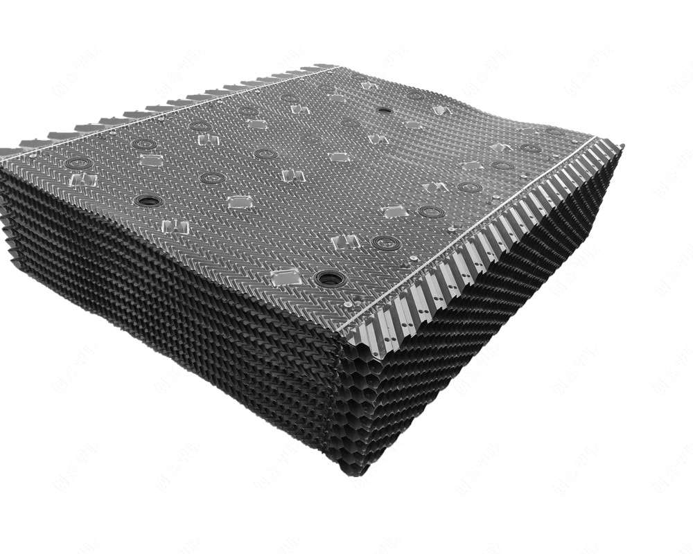 冷卻塔塔芯填料是由優(yōu)質(zhì)PVC聚乙烯片正負(fù)壓及吸塑而成,主要采用了水紋波形、梯形波、點(diǎn)波形、S波型、人字波形填料,散熱面積增長(zhǎng)系數(shù)大,水流在板面上分布性能好,水和空氣流經(jīng)板面時(shí)擾動(dòng)大等優(yōu)點(diǎn)。填料不易變形,耐高溫,抗老化,且阻燃性能好,風(fēng)阻系數(shù)小。安裝方便,易清洗,運(yùn)輸方便該散熱填料采用粘接式及懸掛式,安裝簡(jiǎn)便,便于清洗,且成功解決了粘接填料因吸積垢、自重而產(chǎn)生變形,且變形后積垢更加嚴(yán)重、難于清洗的問題。填料阻燃性能好,阻燃氧指數(shù)指標(biāo)為42.7,每立方米組裝體質(zhì)量約為15 kg—30kg/m3,組裝高度為0.5m—3.0m,交錯(cuò)布置,對(duì)于塔壁周邊異形塊可視現(xiàn)場(chǎng)布置情況,按實(shí)際尺寸切割、安裝。